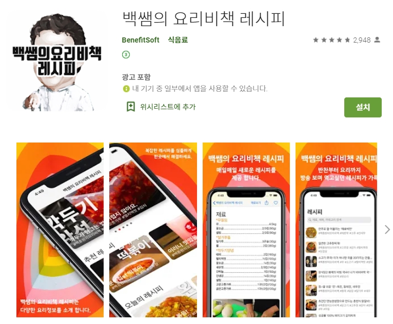 두 번째 소개할 어플은 백쌤의 요리 비책 레시피 어플입니다. 아래는 백쌤의 요리비책 레시피 어플에 대한 자세한 설명이니 참고하세요~