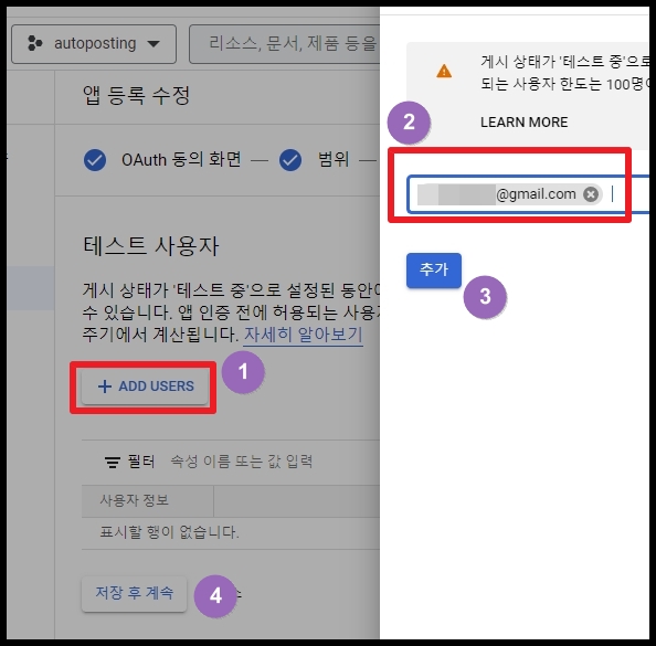 범위에서는 이 API를 사용할 수 있는 범위를 지정합니다. 보통 상단에 있는 3개의 범위를 지정합니다.