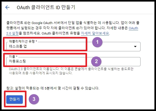 2) 이름은 아무것이나 사용하셔도 됩니다. 저는 자동포스팅이라고 입력했습니다.
