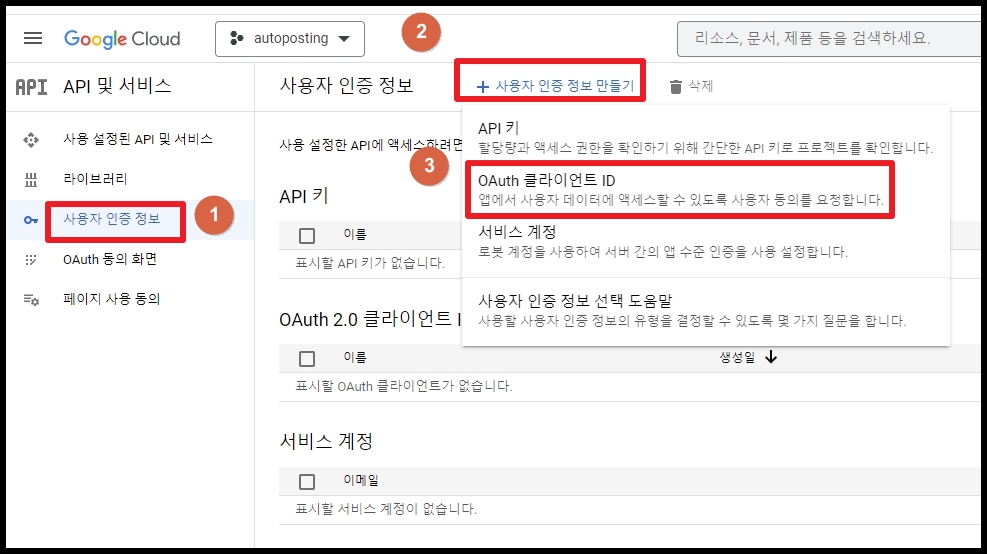 3) 그러면 목록이 아래로 펼쳐집니다. 목록에서 OAuth클라이어트 ID 를 선택합니다.