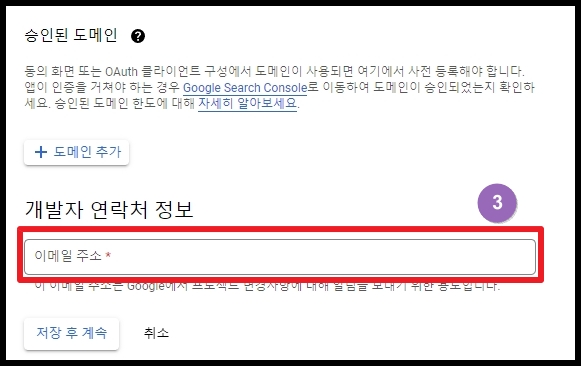 3) 개발자 연락처로 사용할 이메일을 입력합니다. 앞에 입력한 이메일과 동일해도 상관없습니다.