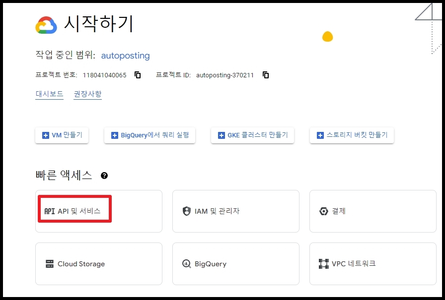 API 및 API 서비스 메뉴를 클릭합니다.
