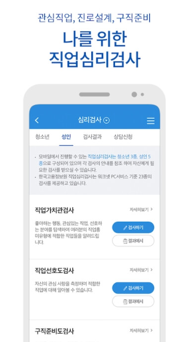 - 청소년, 성인, 대학생 직업 심리검사 및 상담기능 제공