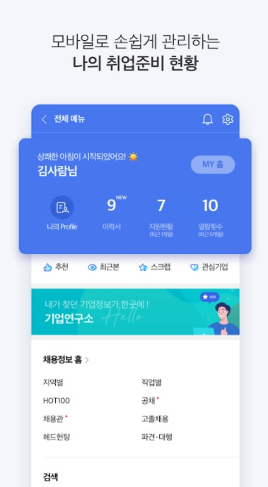 - 나에게 딱 맞는 맞춤 채용 정보로 실시간으로 기업정보 확인하고 입사지원까지!